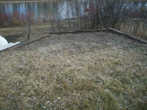 2 x 8’s were placed in front of the ties to allow more dirt to be added because it sloped toward the back too much. Notice that dandy growth of unwanted choke cherry in the back. But it was no match for my son and his two friends who had a pretty nice twig pile in about two hours…and there was only one sliced finger during the whole demolition process!