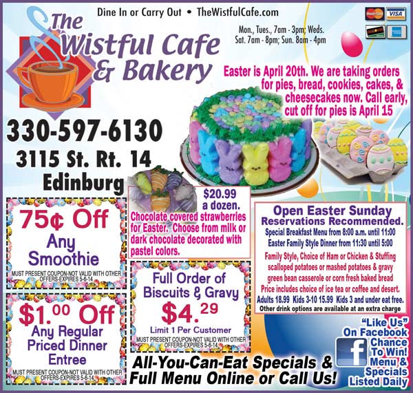 Pies, breads, cookies, cakes, and cheesecake must be ordered by April 15! If you need help making a decision on those Easter desserts, give the bakery a call for ideas! 330-597-6130