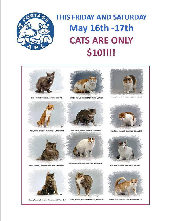 This Friday and Saturday, May 16 and 17, cats are only $10 at the Portage APL! Don’t miss out! Some of these cats have been waiting over six months or even a year. By lowering the price, this gives many of you the opportunity to adopt one. Of course, adopting a cat is a long term commitment and can be costly. The APL hopes they can help with these costs by lowering the initial price so you can afford to purchase some needed care supplies. Please stop by May 16-17 and get a wonderful feline companion for $10. Applicants will need to be approved. All cats are spayed or neutered, up to date on vaccines, and free of fleas and worms.
