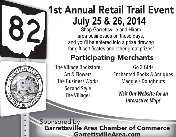 Garrettsville and Hiram are hosting a weekend Retail Trail event on Friday, July 25, and Saturday, 26. This will be a great way to see the villages, support local businesses, and enjoy the weekend in beautiful Portage County!