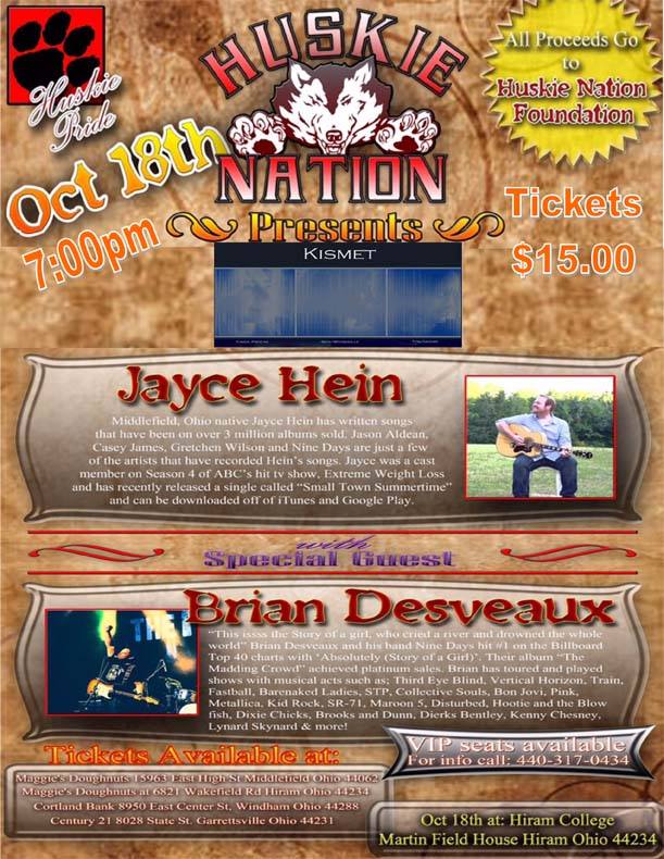 Tonight at the Martin Field house at Hiram College, the Huskie Nation Foundation is hosting a benefit concert to help raise funds for the building of a new track along with other upgrades. Jayce Hein along with Brian Desveaux of the Band Nine Days will be performing.