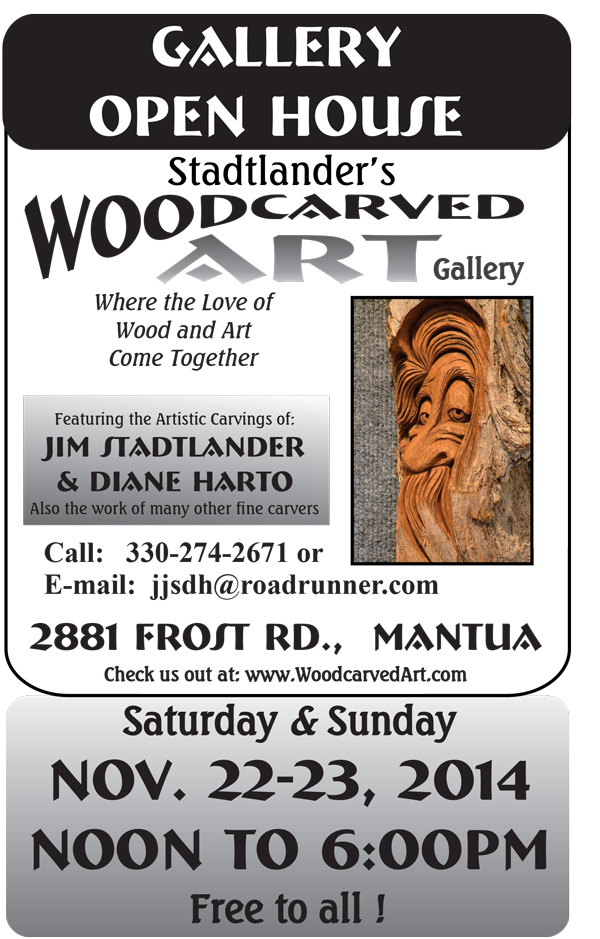 Situated on a wooded 70 acre farm in Mantua, accomplished carvers and owners Jim Stadtlander and Diane Harto, a husband and wife team, operate the Woodcarved Art Gallery. The gallery itself is packed with stunning wood carvings. Several out buildings on the property are where Jim takes freshly cut trees through the whole process of milling, drying, and making the wood ready for carving. There is also a carving school where Diane teaches weekly classes and holds weekend workshops.