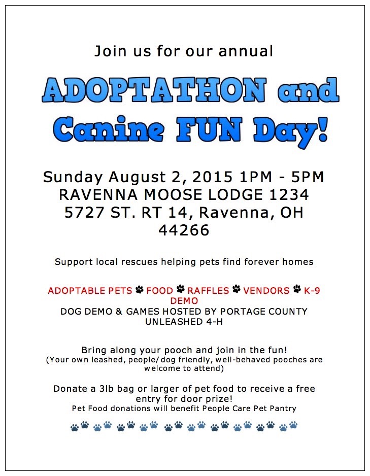 Support local rescues helping pets find forever homes. At Rose’s Rescue Adopt-a-thon and Canine Fun Day you will have the chance to see adoptable pets, food, raffles, vendors, K9 Dog Demo’s and games hosted by Portage County Unleashed 4-H.