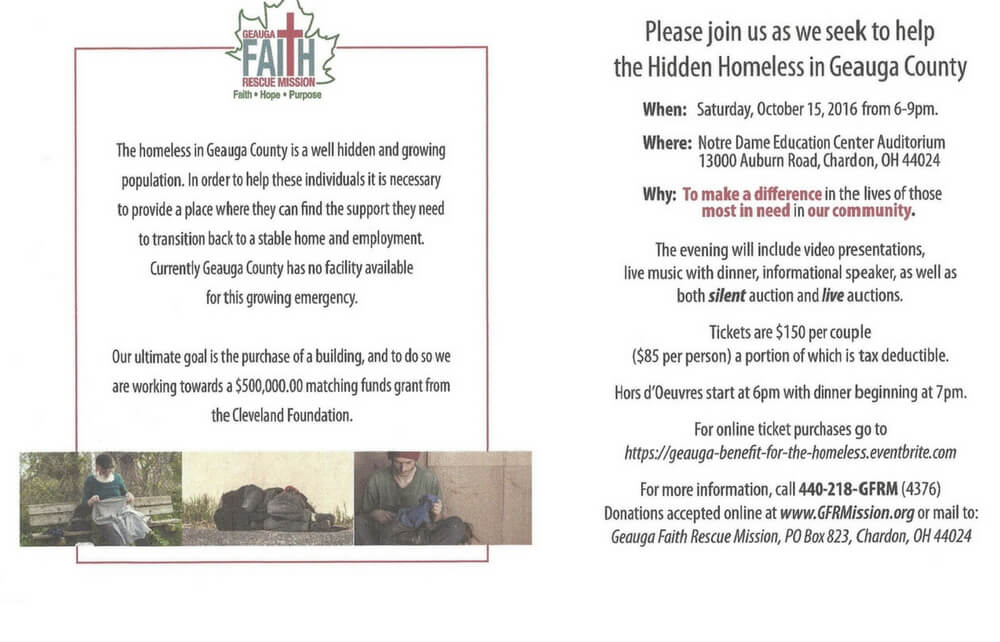 For online ticket purchases go to https://geauga-benefit-for-the-homeless.eventbrite.com For more information, call 440-218-GFRM (4376) Donations accepted online at www.GFRMission.org or mail to: Geauga Faith Rescue Mission, PO Box 823, Chardon, OH 44024