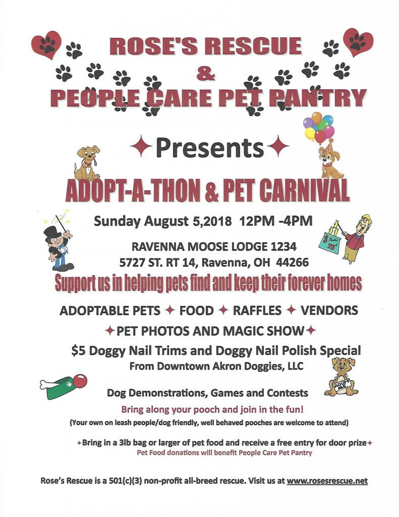 Join Rose’s Rescue and People Care Pet Pantry at the Ravenna Moose Lodge 1234, 5727 St Rt 14, Ravenna, OH 44266 on Saturday, August 5th from 12:00 p.m. – 4:00 p.m. for the Pet Adopt-a-Thon and Pet Carnival!