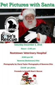 Bring your pets out to Rootstown Veterinary Hospital on December 3rd and have their pictures taken with Santa Claus. $10.00 per photo. Photos taken by Cheryl Taylor Photography of Ravenna Ohio. Proceeds to benefit Rose's Rescue.